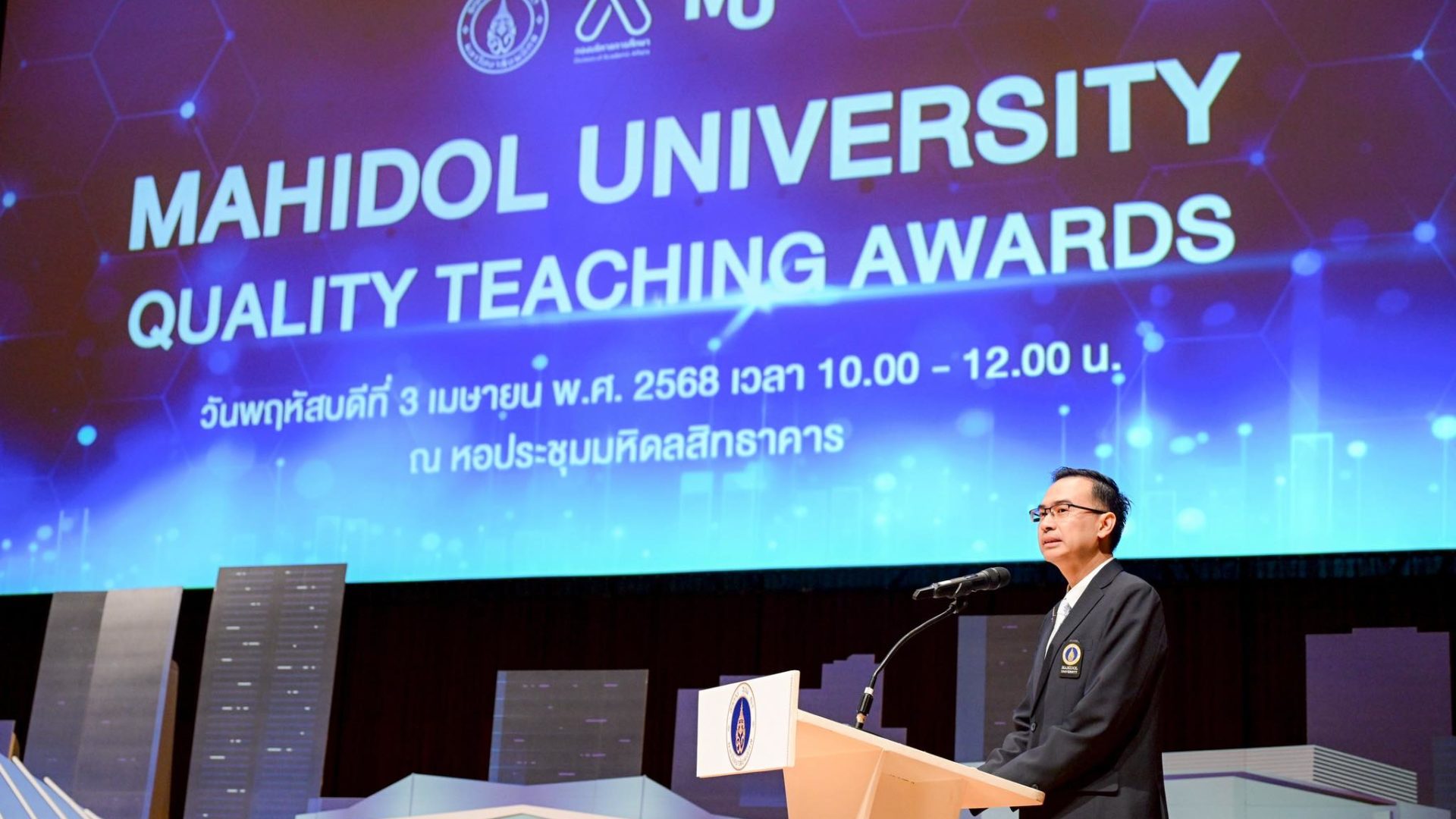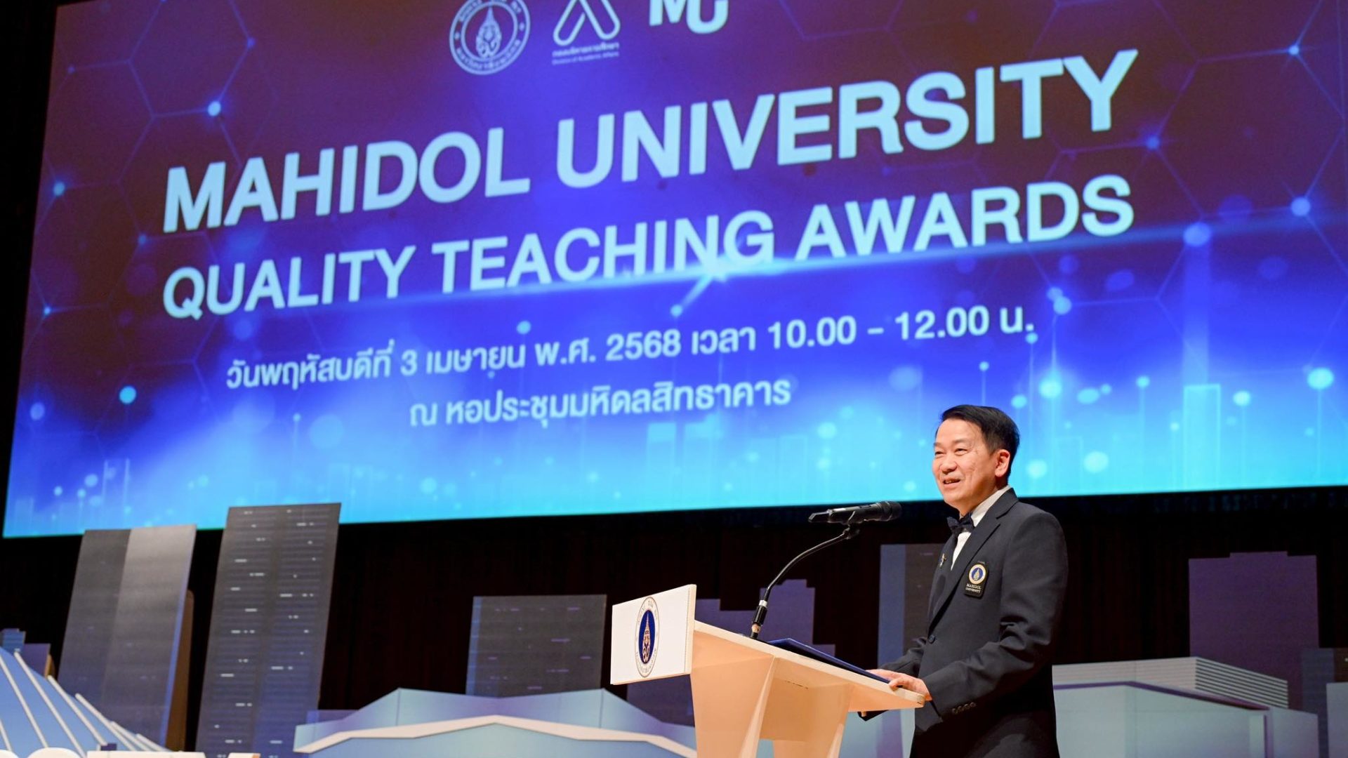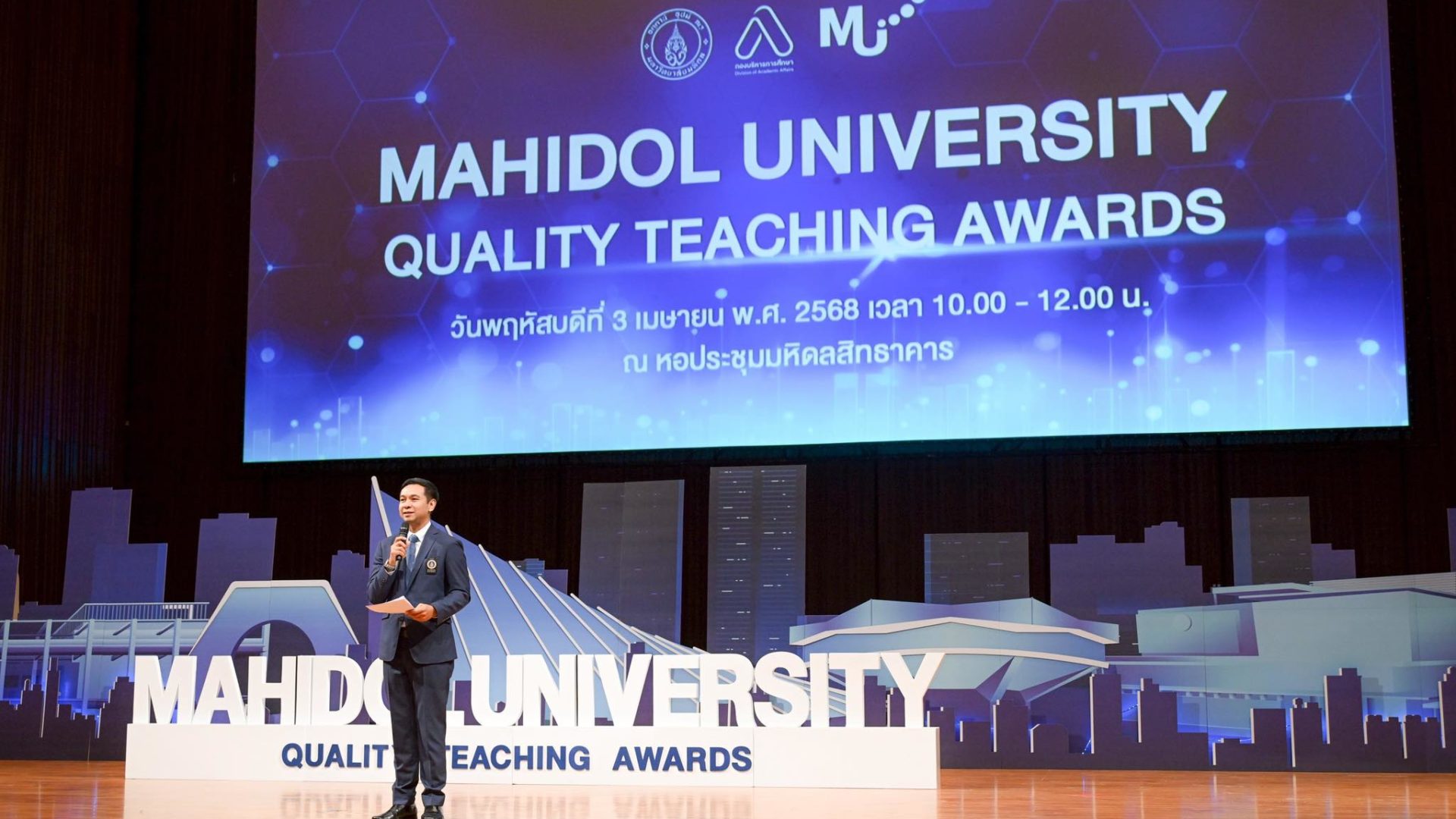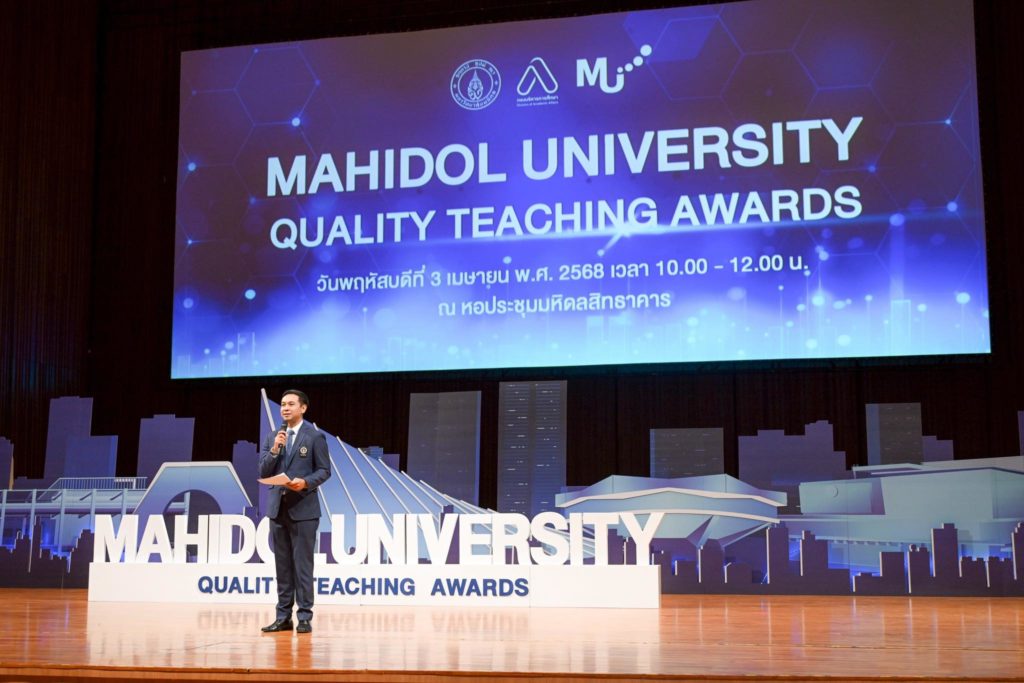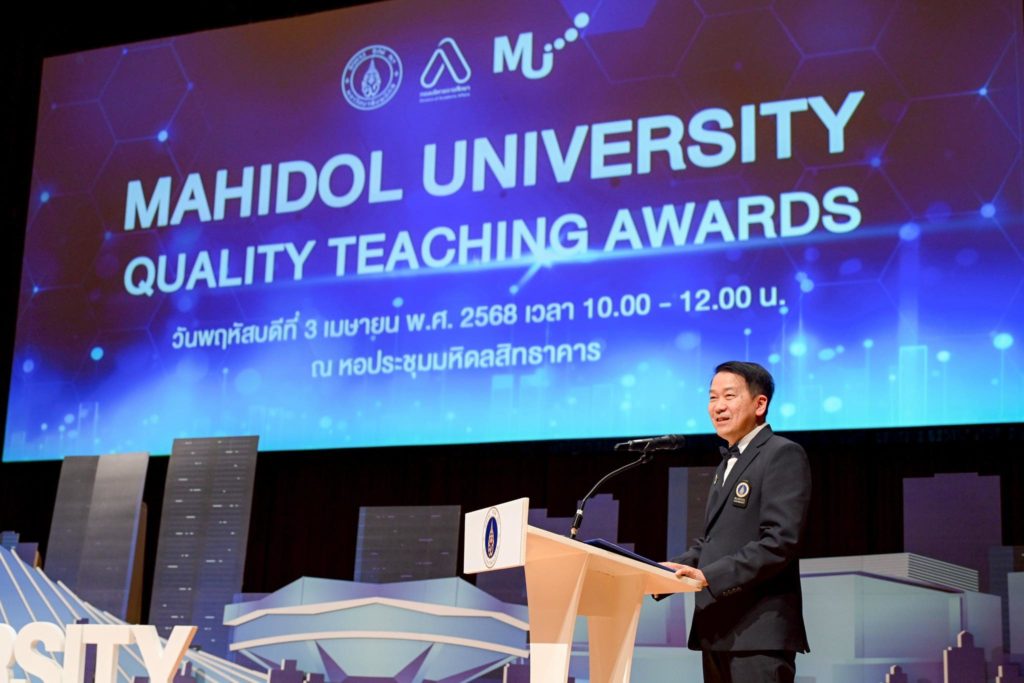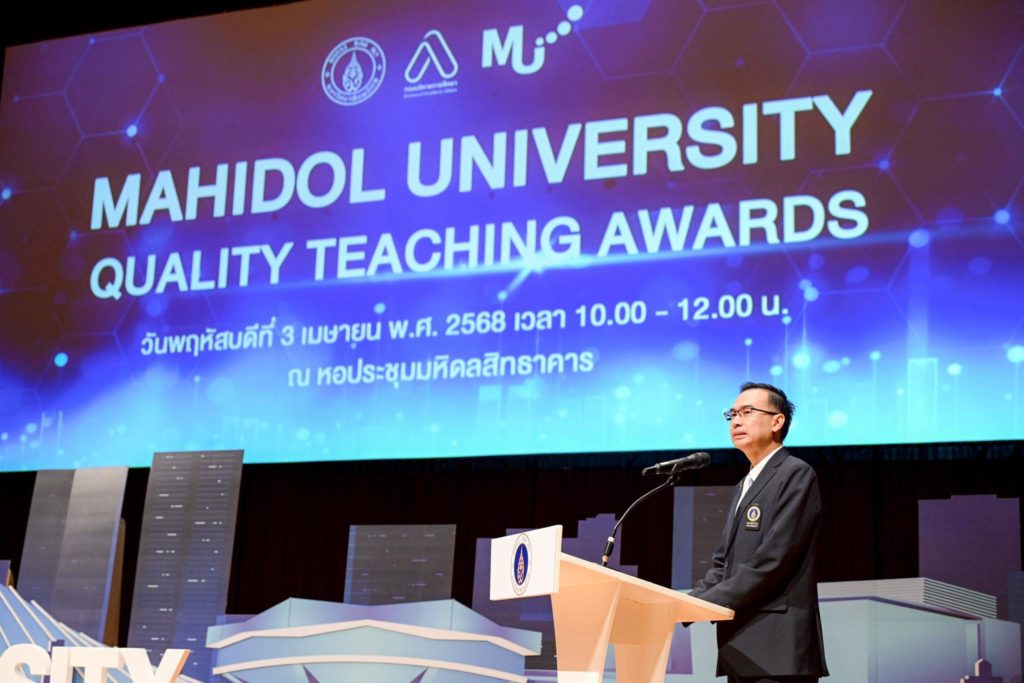วันที่ 3 เมษายน 2568 ศาสตราจารย์ นายแพทย์ปิยะมิตร ศรีธรา อธิการบดีมหาวิทยาลัยมหิดล เป็นประธานในงาน Mahidol University Quality Teaching Awards พร้อมมอบประกาศนียบัตร และโล่รางวัล ให้แก่คณาจารย์ ของมหาวิทยาลัยมหิดล เพื่อเป็นการยกย่อง เชิดชูคณาจารย์ที่มีความโดดเด่นในด้านการจัดการเรียนการสอน โดยมี รองศาสตราจารย์ ดร. เภสัชกรเนติ สุขสมบูรณ์ รองอธิการบดีฝ่ายการศึกษา มหาวิทยาลัยมหิดล กล่าวรายงานผลการดำเนินงานที่ผ่านมา และ อาจารย์ ดร.ระพี บุญเปลื้อง รองคณบดีฝ่ายสื่อสารองค์กรและวิเทศสัมพันธ์ คณะวิทยาศาสตร์ มหาวิทยาลัยมหิดล เป็นผู้ดำเนินรายการ พร้อมด้วย ผู้บริหารมหาวิทยาลัยมหิดล ผู้บริหารส่วนงาน เข้าร่วมพิธี ณ หอประชุมมหิดลสิทธาคาร มหาวิทยาลัยมหิดล ศาลายา