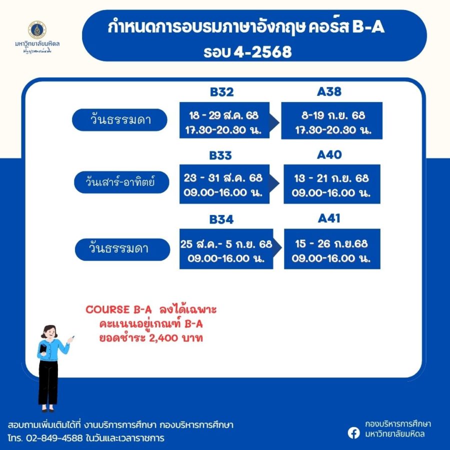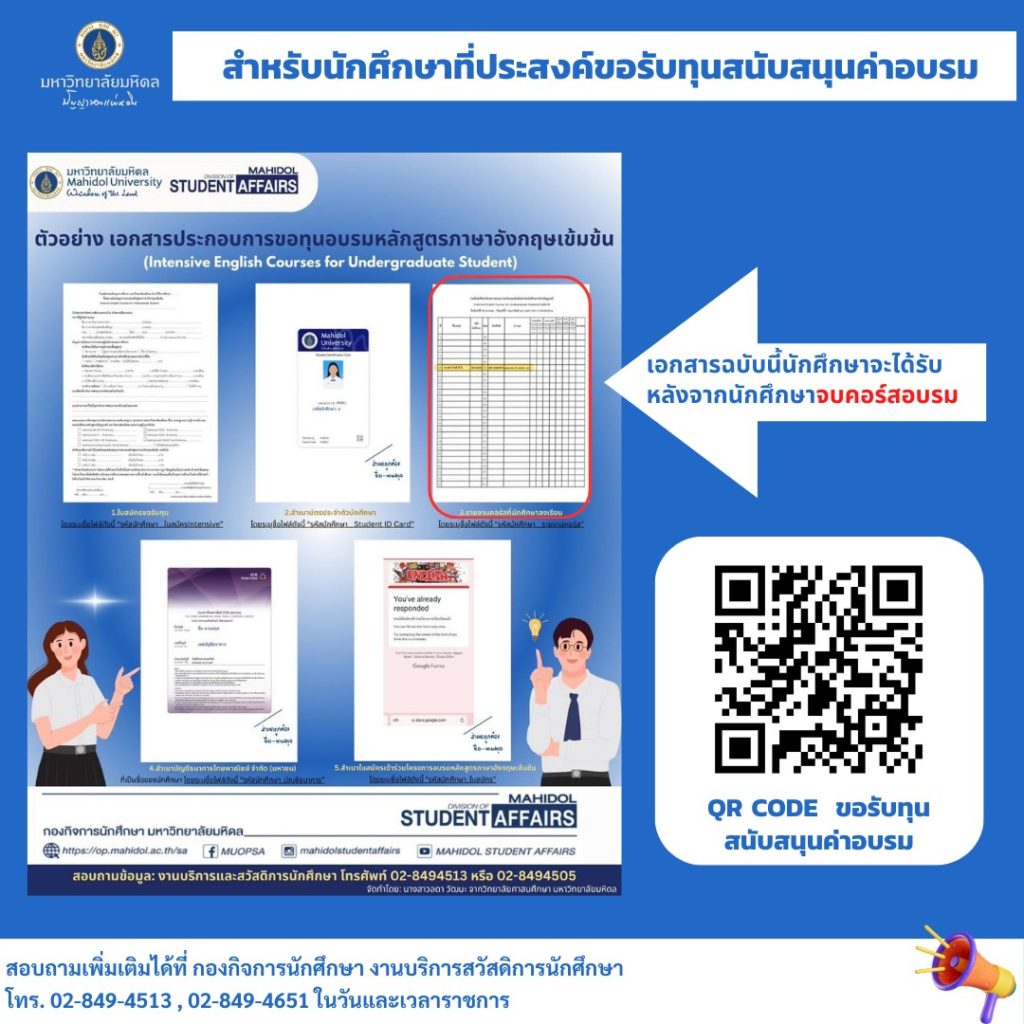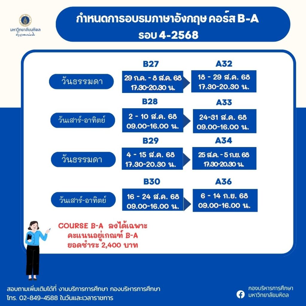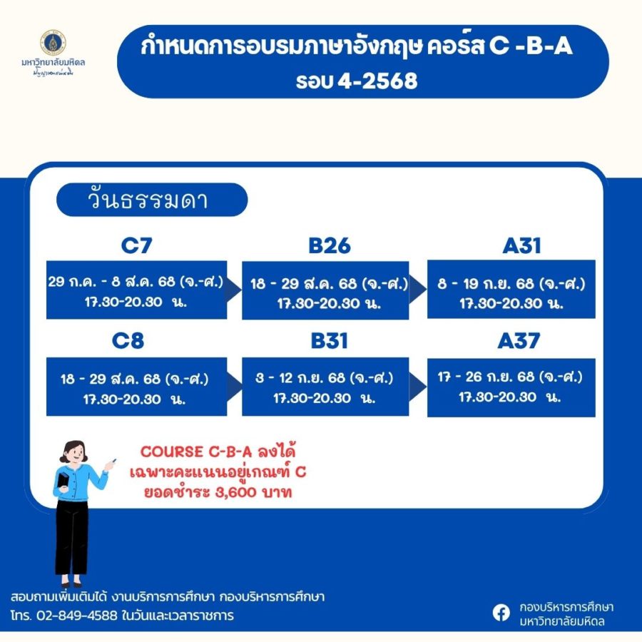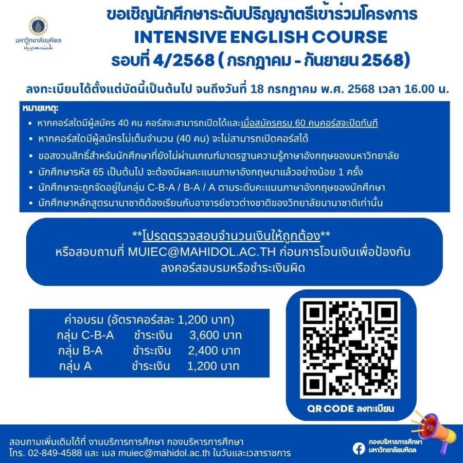 - ประกาศมหาวิทยาลัยมหิดล เรื่อง หลักเกณฑ์ อัตราค่าอบรม ภาษาอังกฤษเข้มข้น ป.ตรี 2566