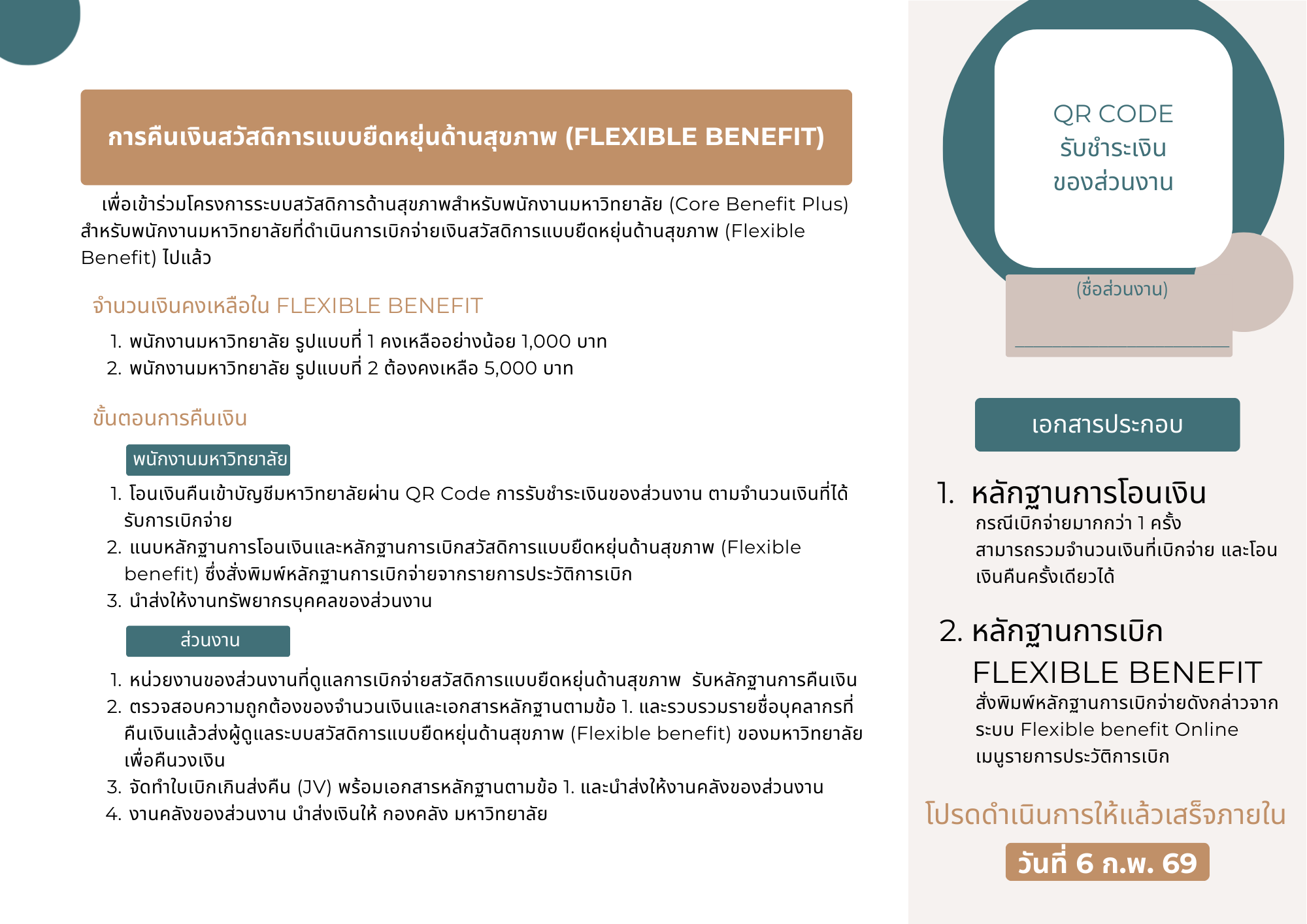 | ต้องแสดงความประสงค์เข้าร่วมโครงการก่อน จากนั้นให้ คืนเงิน ที่ได้รับจาก FlexBen ให้มหาวิทยาลัยผ่านส่วนงาน โดยดำเนินการผ่าน QR Code ภายในวันที่ 1 มกราคม ถึง