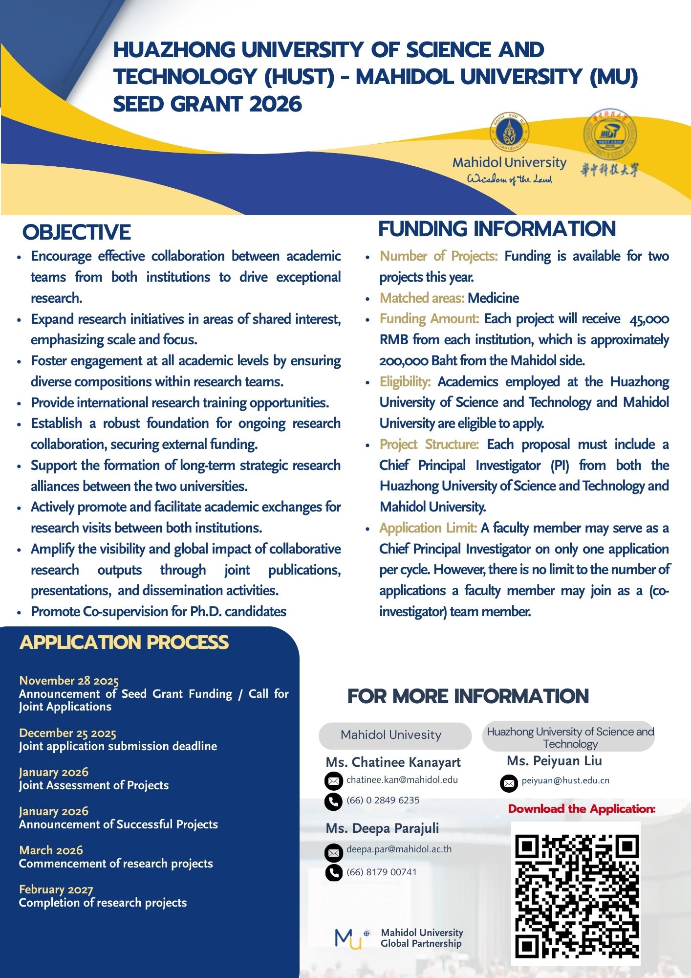 - Eligibility: Academics employed at the Huazhong University of Science and Technology and Mahidol University are eligible to apply..
