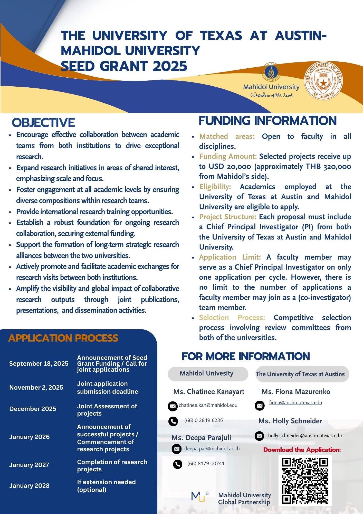 - Eligibility: Academics employed at the University of Austin in Texas and Mahidol University are eligible to apply.