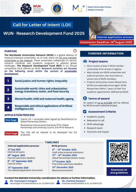 We invite Mahidol University’s researchers who are interested to submit the Letter of Intent (LOI) to apply for the WUN Research Development Fund (RDF) in the internal application process organized by the International Relations Division, Mahidol University.