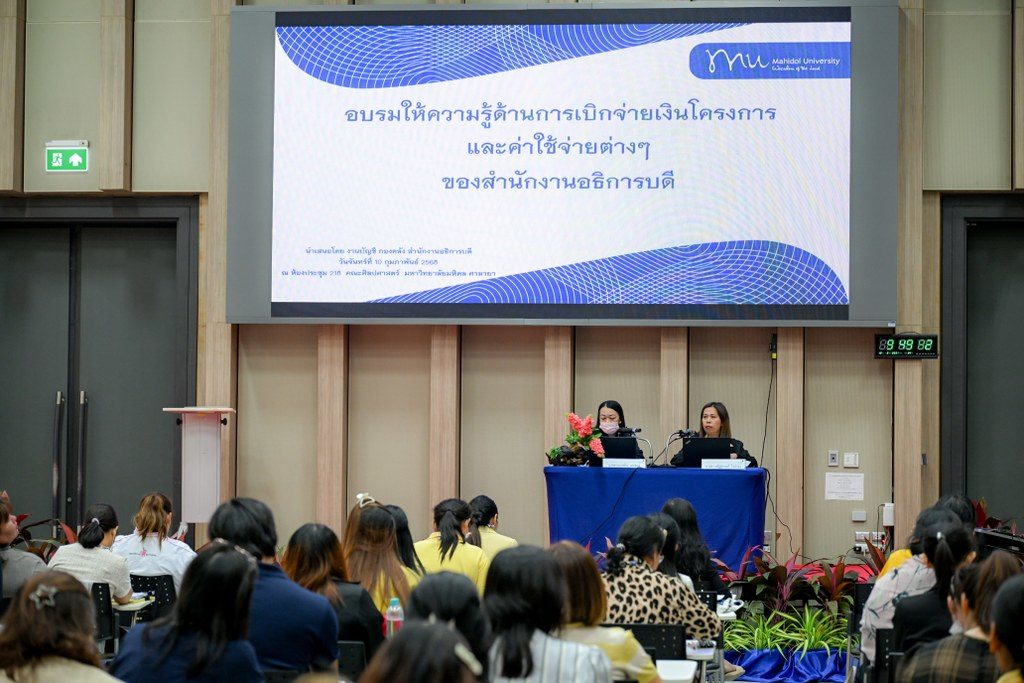 วันที่ 10 กุมภาพันธ์ 2568 ดร.ศรายุธ แสงจันทร์ รองอธิการบดีฝ่ายการคลัง มหาวิทยาลัยมหิดล เป็นประธานกล่าวเปิดโครงการอบรมให้ความรู้ด้านการเบิกจ่ายเงินโครงการและค่าใช้จ่ายต่าง ๆ ของสำนักงานอธิการบดี ประจำปีงบประมาณ 2568 โดยมีบุคลากรของกองคลัง มหาวิทยาลัยมหิดล ร่วมให้ข้อมูลชี้แจงแนวทางการดำเนินงาน ในหัวข้อ “ค่าใช้จ่ายในการจัดโครงการ กิจกรรม ค่าใช้จ่ายในการเดินทางไปราชการ” “เอกสารประกอบการวางเบิกจ่ายด้านพัสดุ” “แนวทางการใช้งบประมาณ และการใช้แบบฟอร์มเบิกค่าโทรศัพท์เคลื่อนที่” จัดโดย กองคลัง มหาวิทยาลัยมหิดล เพื่อให้ผู้เข้าร่วมมีความรู้ความเข้าใจในระเบียบ ข้อบังคับ และแนวปฏิบัติเกี่ยวกับการเบิกจ่ายเงินโครงการและค่าใช้จ่ายต่าง ๆ ของสำนักงานอธิการบดี มหาวิทยาลัยมหิดล ลดปัญหา และข้อผิดพลาดที่อาจเกิดขึ้นจากการเบิกจ่ายที่ไม่เป็นไปตามระเบียบ อีกทั้งสามารถปฏิบัติงานด้านการเบิกจ่ายได้อย่างถูกต้อง โปร่งใส และมีประสิทธิภาพต่อไป ณ ห้องประชุม 218 ชั้น 2 อาคารสิริวิทยา คณะศิลปศาสตร์ มหาวิทยาลัยมหิดล