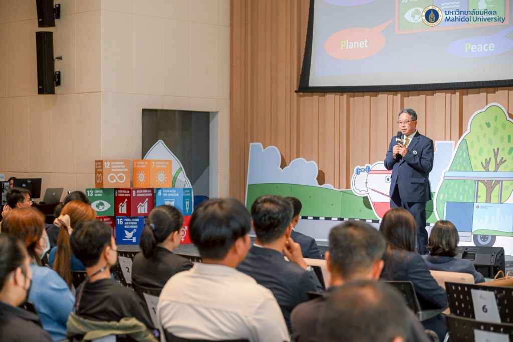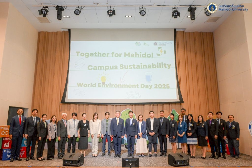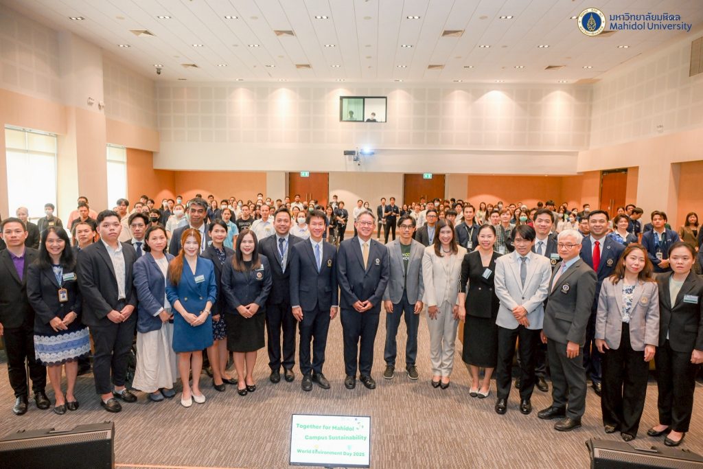 วันที่ 6 มิถุนายน 2568 ศาสตราจารย์ นายแพทย์ปิยะมิตร ศรีธรา อธิการบดีมหาวิทยาลัยมหิดล เป็นประธานเปิดกิจกรรม “Together for Mahidol Campus Sustainability” พร้อมนี้ รองศาสตราจารย์ ดร. เภสัชกรสมภพ ประธานธุรารักษ์ รองอธิการบดีฝ่ายแผนกลยุทธ์ พัฒนาคุณภาพและพันธกิจเพื่อสังคม มหาวิทยาลัยมหิดล ได้กล่าวรายละเอียดถึงความก้าวหน้าในการดำเนินงานด้านความยั่งยืนของมหาวิทยาลัย และได้รับเกียรติจาก รองศาสตราจารย์ ดร.วิชิตา รักธรรม รองอธิการบดีฝ่ายสื่อสารองค์กรและภาพลักษณ์ มหาวิทยาลัยมหิดล ผู้ช่วยศาสตราจารย์ ดร.นริศ หนูหอม ผู้ช่วยอธิการบดีฝ่ายสารสนเทศและดิจิทัลทรานฟอร์เมชัน มหาวิทยาลัยมหิดล ผู้บริหารและผู้แทนส่วนงานเข้าร่วมกิจกรรม โดย งานพัฒนาเพื่อความยั่งยืน กองกายภาพและสิ่งแวดล้อม มหาวิทยาลัยมหิดล จัดขึ้น เนื่องในวันสิ่งแวดล้อมโลก เพื่อส่งเสริมการบริโภคอย่างรับผิดชอบ สนับสนุนเมนูอาหารเพื่อสุขภาพ การใช้บรรจุภัณฑ์ที่เป็นมิตรกับสิ่งแวดล้อม และลดขยะพลาสติกแบบใช้ครั้งเดียวทิ้ง เพื่อมุ่งสู่เป้าหมายการปล่อยก๊าซเรือนกระจกสุทธิเป็นศูนย์ (Net Zero Emission) ณ ห้อง 322 ศูนย์การเรียนรู้มหิดล ศาลายา