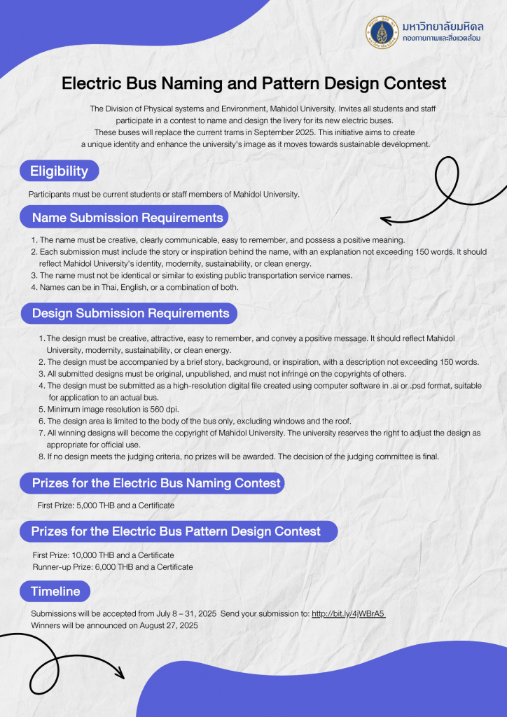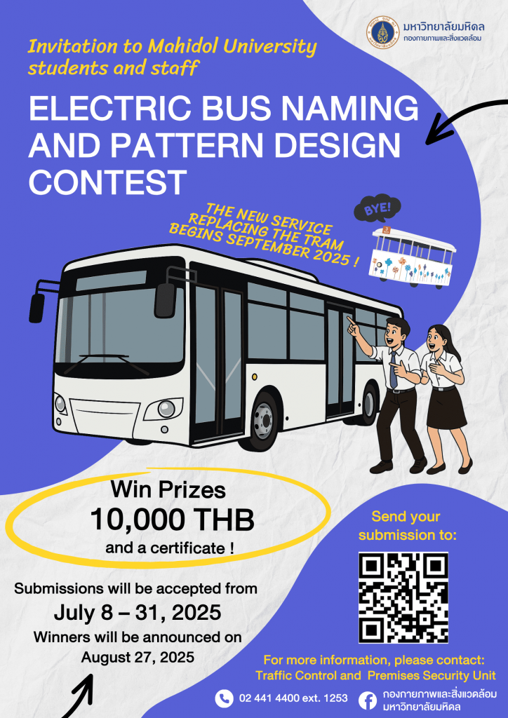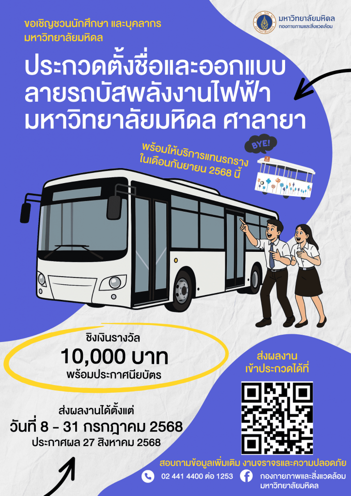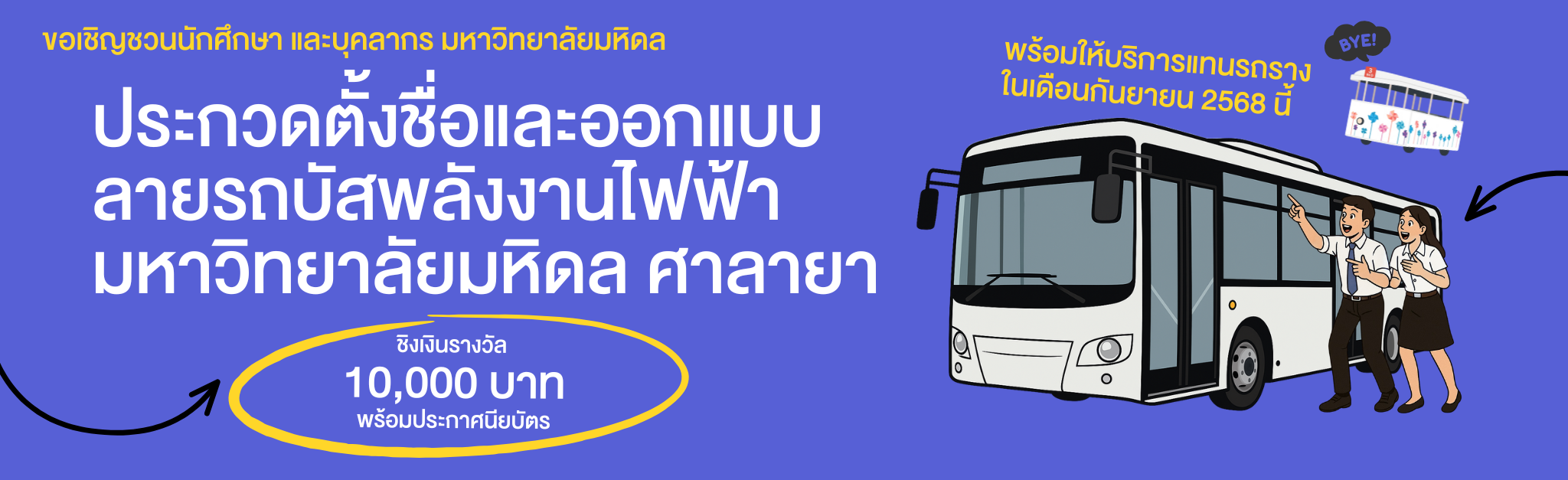 • โครงการประกวดตั้งชื่อและออกแบบลวดลายรถบัสพลังงานไฟฟ้า ให้บริการภายในวิทยาเขตศาลายา