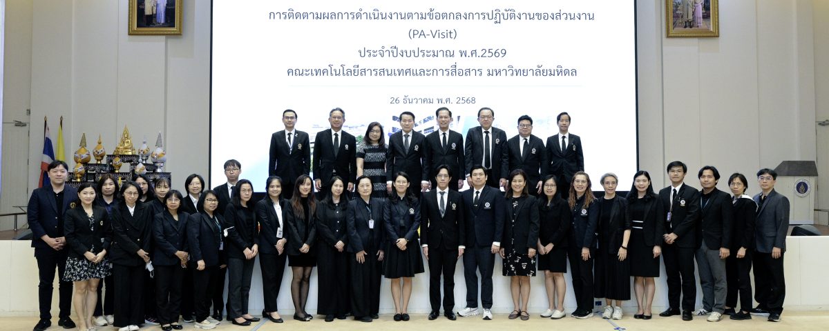 วันที่ 26 ธันวาคม 2568 เวลา 13.00-14.00 น. ศาสตราจารย์ นพ.ปิยะมิตร ศรีธรา อธิการบดีมหาวิทยาลัยมหิดล พร้อมด้วยคณะผู้บริหารมหาวิทยาลัยมหิดล เข้ารับฟังข้อตกลงการปฏิบัติงานของส่วนงาน (PA-Visit) ประจำปีงบประมาณ 2569 ของคณะเทคโนโลยีสารสนเทศและการสื่อสาร โดยมี ดร.พัฒนศักดิ์ มงคลวัฒน์ คณบดี คณะเทคโนโลยีสารสนเทศและการสื่อสาร พร้อมด้วยผู้บริหารส่วนงานให้การต้อนรับ และนำเสนอผลการดำเนินงาน พร้อมรับฟังข้อเสนอแนะในการดำเนินงาน ในปีงบประมาณ 2569