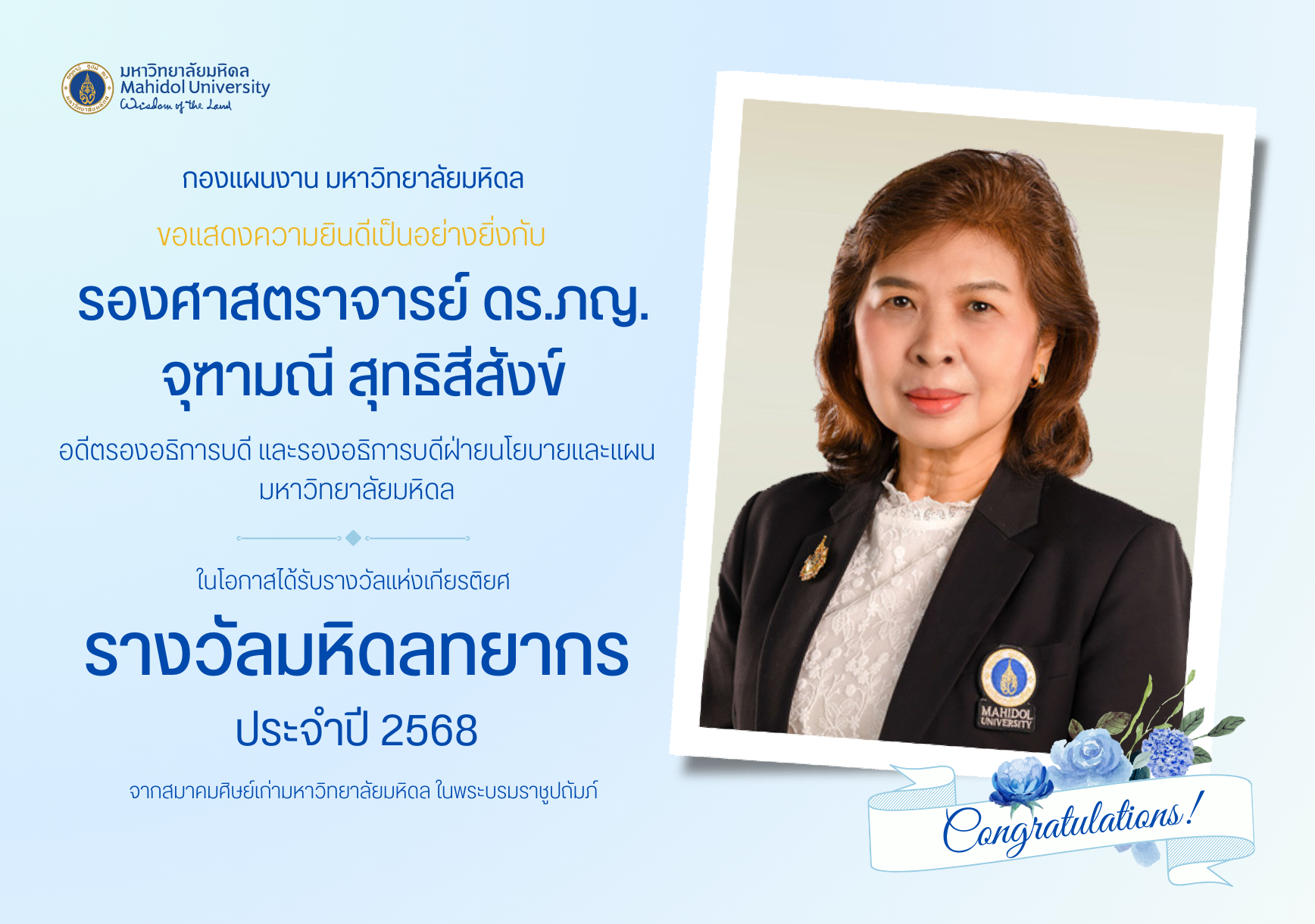 - ประกาศมหาวิทยาลัยมหิดล เรื่อง ทุนสนับสนุนโครงการมหิดลเพื่อการเปลี่ยนแปลง รุ่นที่ 1 (Mahidol Change Agent #1) พ.ศ. 2568