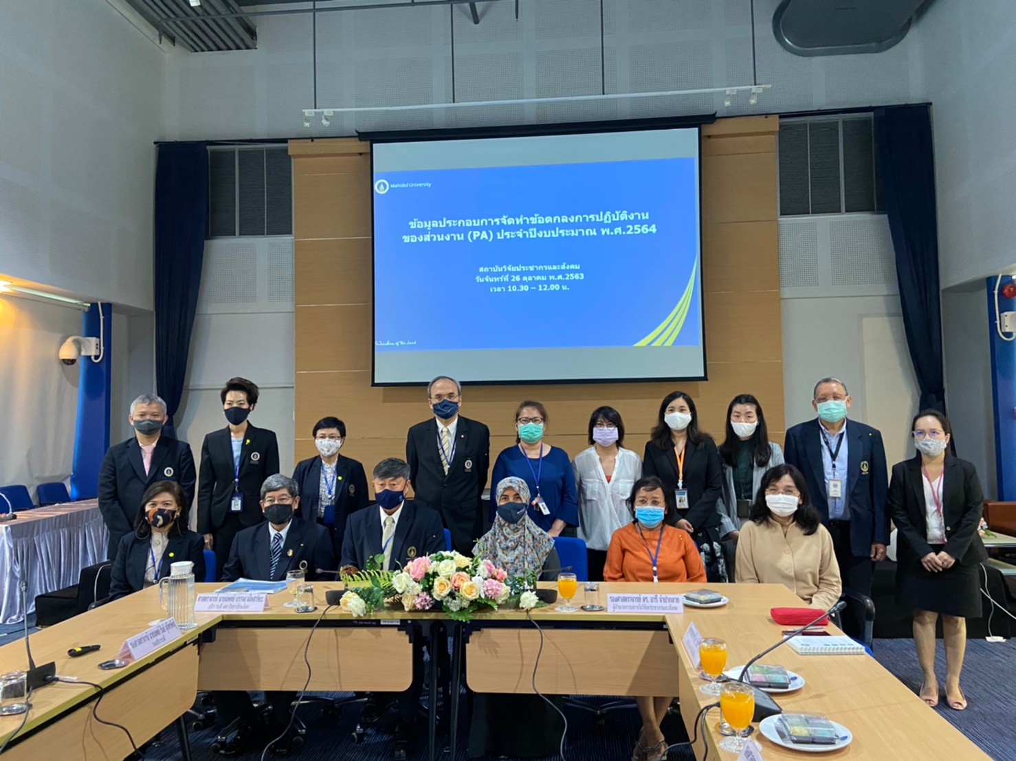 เมื่อวันที่ 26 ตุลาคม 2563 เวลา 08.45 – 10.15 น. ศาสตราจารย์ นายแพทย์บรรจง มไหสวริยะ อธิการบดีมหาวิทยาลัยมหิดล พร้อมด้วยคณะผู้บริหารมหาวิทยาลัยมหิดล เข้ารับฟังข้อตกลงการปฏิบัติงานของส่วนงาน (PA-Visit) ประจำปีงบประมาณ 2564 ของศูนย์จิตตปัญญาศึกษา โดยมี รองศาสตราจารย์ นายแพทย์ชัชวาลย์ ศิลปกิจ ผู้อำนวยการ ศูนย์จิตตปัญญาศึกษา พร้อมด้วยคณะผู้บริหารให้การต้อนรับตามลำดับ ในการนี้ อธิการบดีได้มอบหมายทิศทางการบริหารมหาวิทยาลัย พร้อมแลกเปลี่ยนข้อคิดเห็นร่วมกันระหว่างมหาวิทยาลัยและส่วนงาน