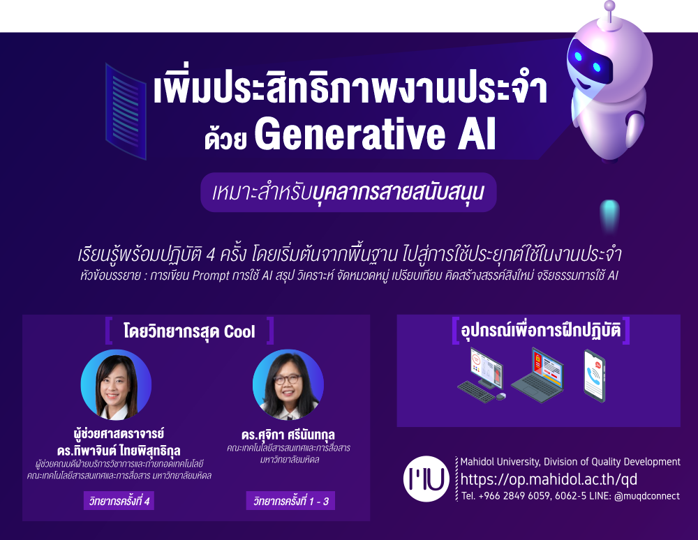 วันที่ อังคาร 22 กรกฎาคม 2568 เวลา 10.00-11.30 รูปแบบ Online: Webex Webinars เหมาะสมกับ บุคลากรที่ปฏิบัติงานสนับสนุนทั่วไป เกี่ยวข้องกับการประชุม การจัดทำเอกสาร การประเมิน สรุปผล ตรวจสอบความถูกต้อง รวมทั้งการสร้างContent งานสร้างสรรค์ หรืองานอื่นๆ ที่สามารถนำความรู้เหล่านี้ไปประยุกต์ใช้ได้ เนื้อหา AI ช่วยงานประจำได้อย่างไร (# 1) ผู้เข้าร่วมจะได้เรียนรู้หลักการการเขียน Prompt และตัวอย่าง, การใส่ข้อข้อความ ภาพLink หรือ File ให้ AI ช่วยตรวจสอบ อธิบาย สรุป, วิธีการถามย้อนกลับเพื่อให้ AI ตอบได้ตรงจุดตามที่ต้องการ เป็นต้น ฝึกปฏิบัติ : ใช้คำสั่งให้สรุปข้อมูล และจัดลำดับประเด็นสำคัญ, ทดลอง Upload File, คิดหัวข้อกิจกรรม