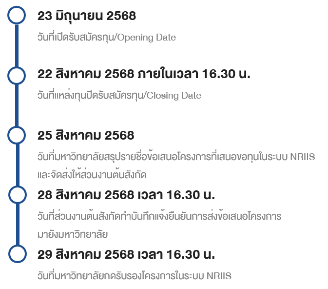 | วันที่มหาวิทยาลัยสรุปรายชื่อข้อเสนอโครงการที่เสนอขอทุนในระบบ NRIIS และจัดส่งให้ส่วนงานต้นสังกัด | 25 สิงหาคม 2568 |