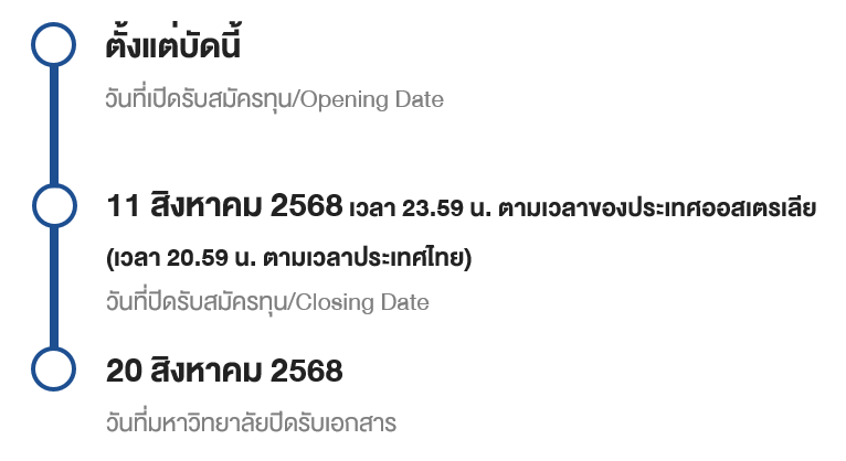 | วันที่เปิด – ปิดรับสมัครทุน/Opening – Closing Date | บัดนี้ ถึง 11 สิงหาคม 2568 เวลา 23.59 น. ตามเวลาของประเทศออสเตรเลีย (เวลา 20.59 น. ตามเวลาประเทศไทย) |