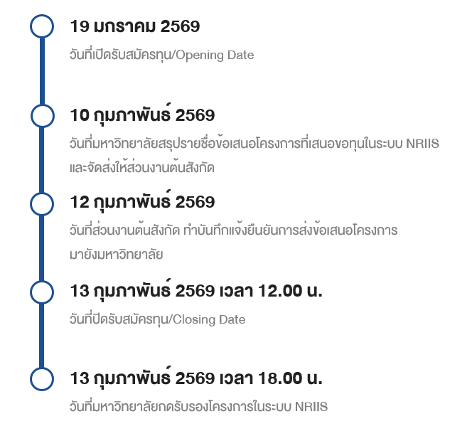 – มหาวิทยาลัยสรุปรายชื่อข้อเสนอโครงการที่เสนอขอทุนในระบบ NRIIS และจัดส่งให้ส่วนงานต้นสังกัด: ภายในวันที่ 10 กุมภาพันธ์ 2569