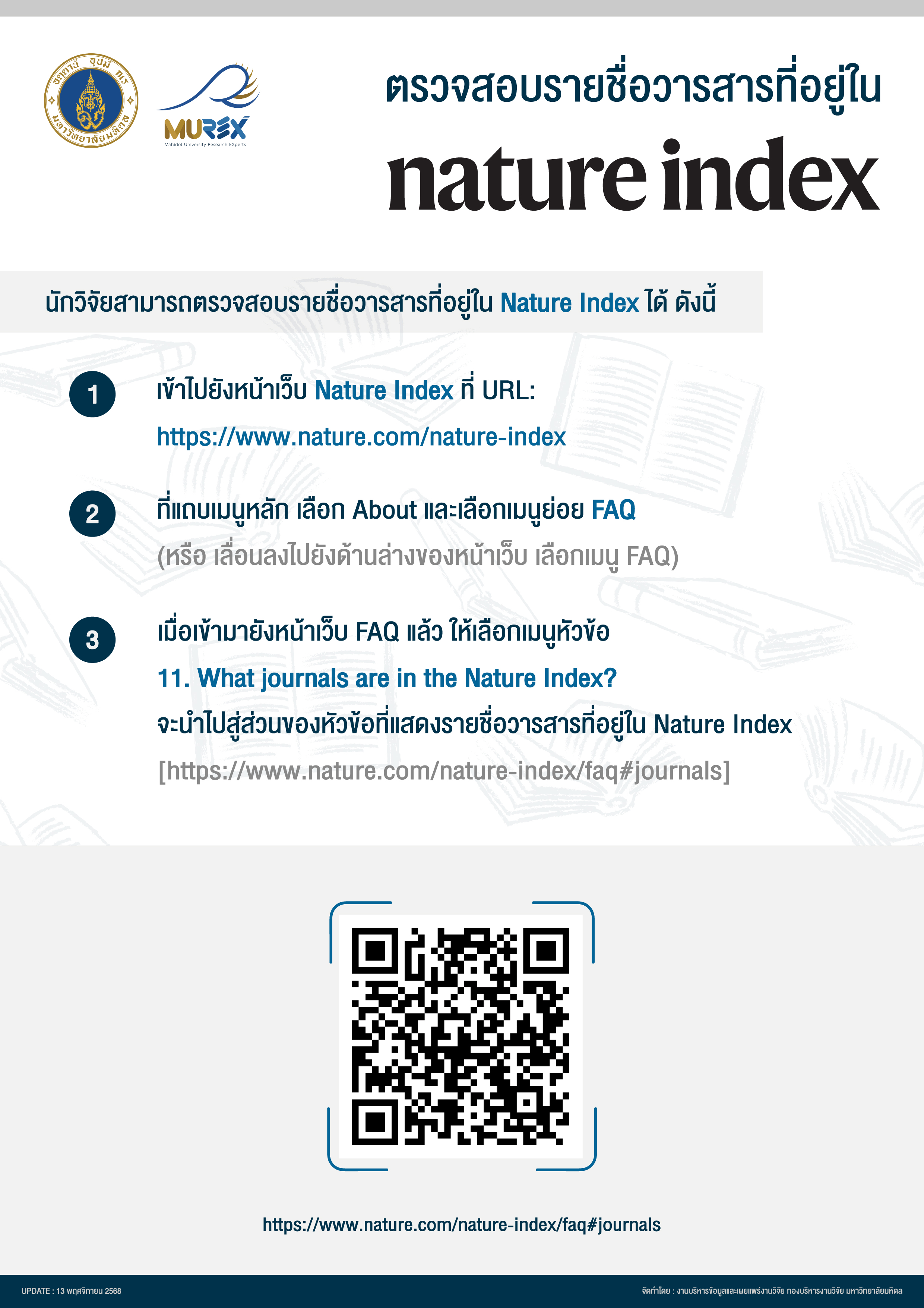 • Mahidol University Announcement on Criteria and Rates for Granting of Manuscript Preparing Fees, Article Processing Charges, and Reward for Publication of Article in an International-level Journal, B.E. 2568 (2025) [Announced on 2nd January B.E. 2568 (A.D. 2025)] (ยกเลิก)