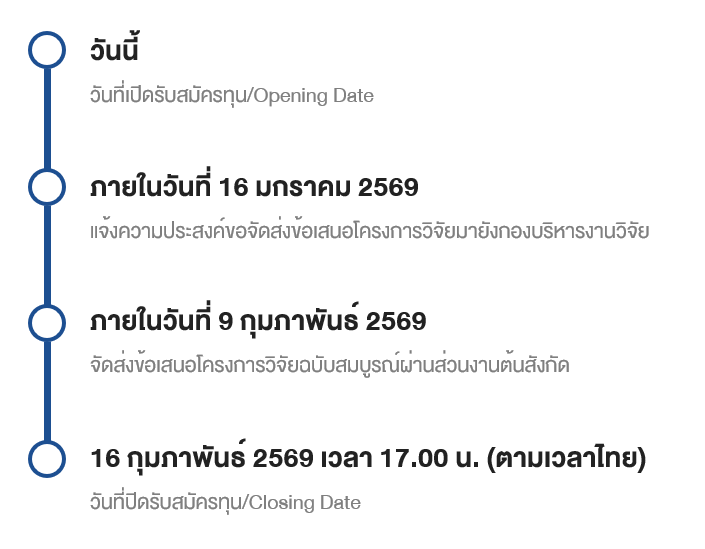 | วันที่มหาวิทยาลัยปิดรับเอกสารทุน/MU Closing Date | แจ้งความประสงค์ขอจัดส่งข้อเสนอโครงการวิจัยมายังกองบริหารงานวิจัย ภายในวันที่ 16 มกราคม 2569 จัดส่งข้อเสนอโครงการวิจัยฉบับสมบูรณ์ผ่านส่วนงานต้นสังกัด ภายในวันที่ 9 กุมภาพันธ์ 2569 |