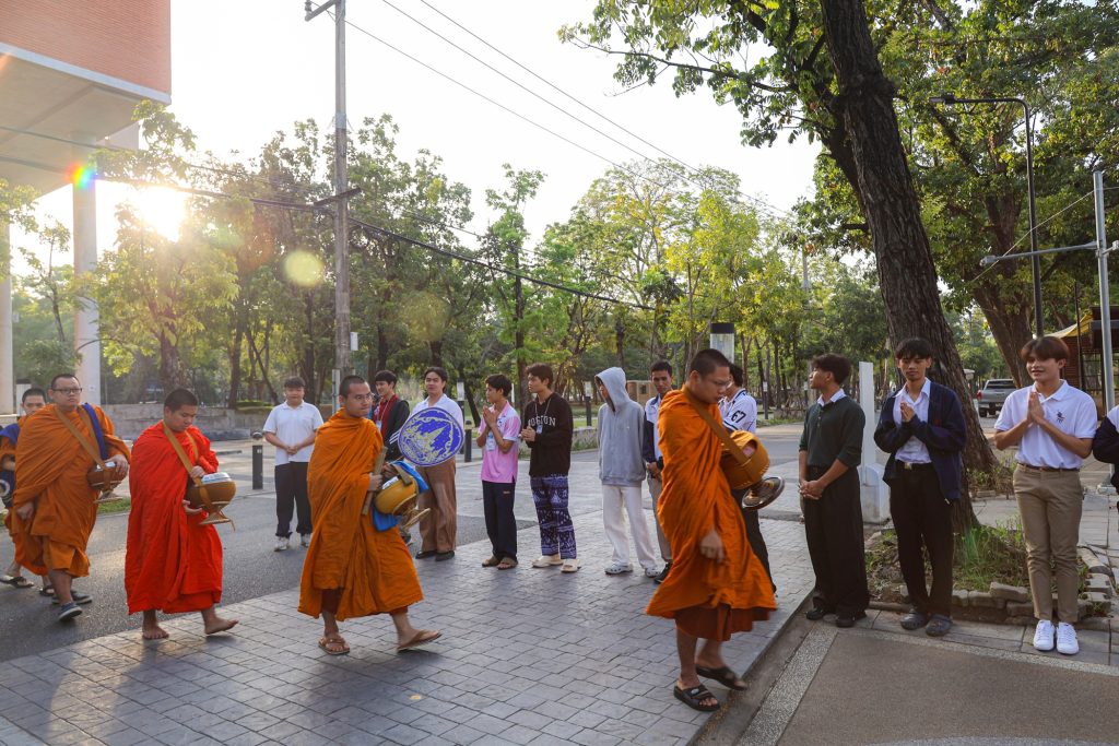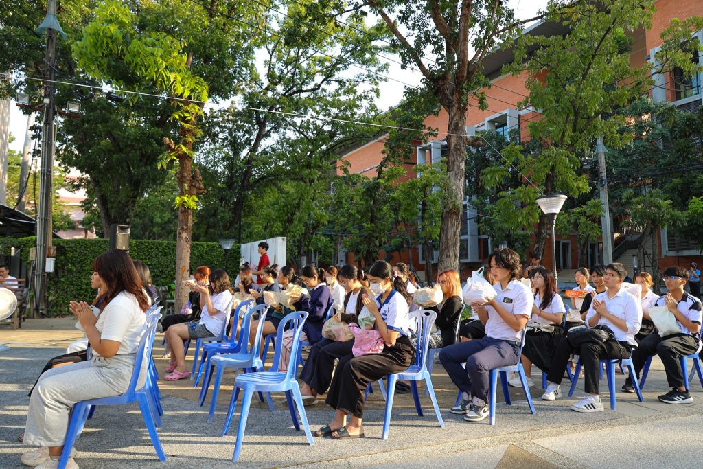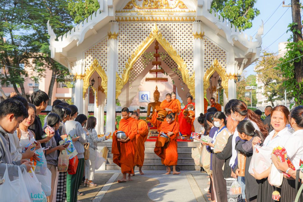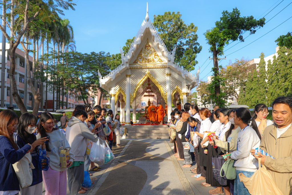พระสงฆ์ได้ประกอบพิธีทางศาสนา โดยมีตัวแทนนักศึกษานำกล่าวถวายข้าวพระพุทธและถวายสังฆทาน พร้อมกันนี้บุคลากรกองกิจการนักศึกษา และผู้เข้าร่วมงานได้ร่วมกันใส่บาตรและถวายภัตตาหารเช้าแด่พระสงฆ์ ก่อนจะรับการสวดอนุโมทนา กรวดน้ำ และประพรมน้ำมนต์เพื่อความเป็นสิริมงคลและความเจริญก้าวหน้าแก่ทุกท่านตลอดไป