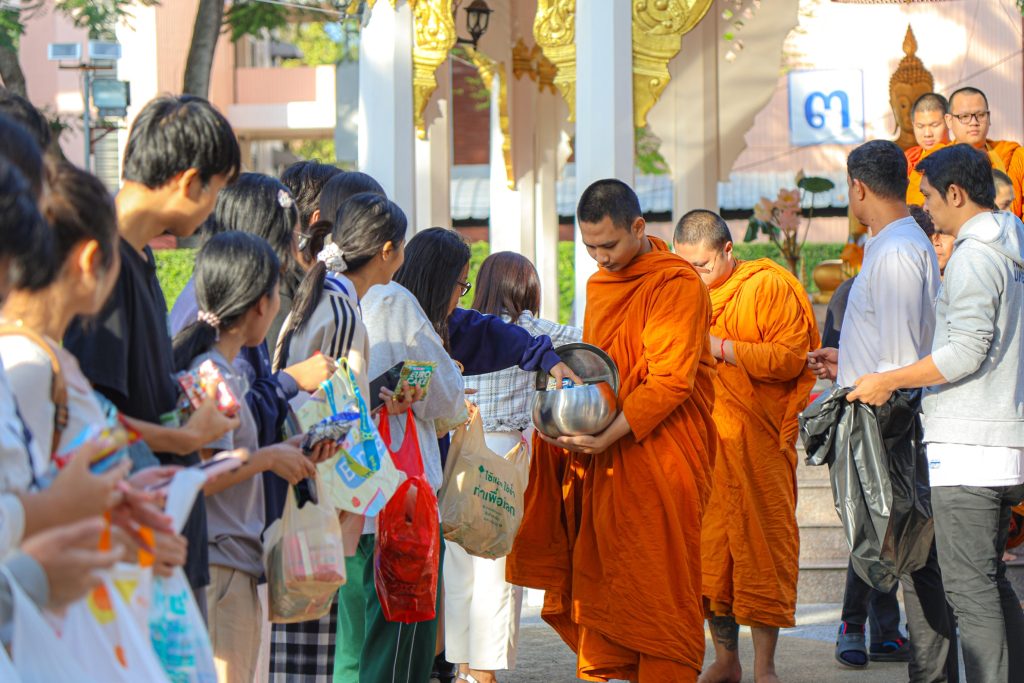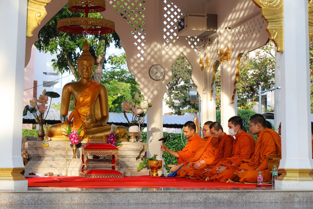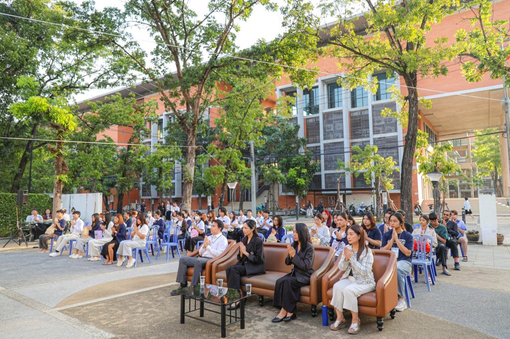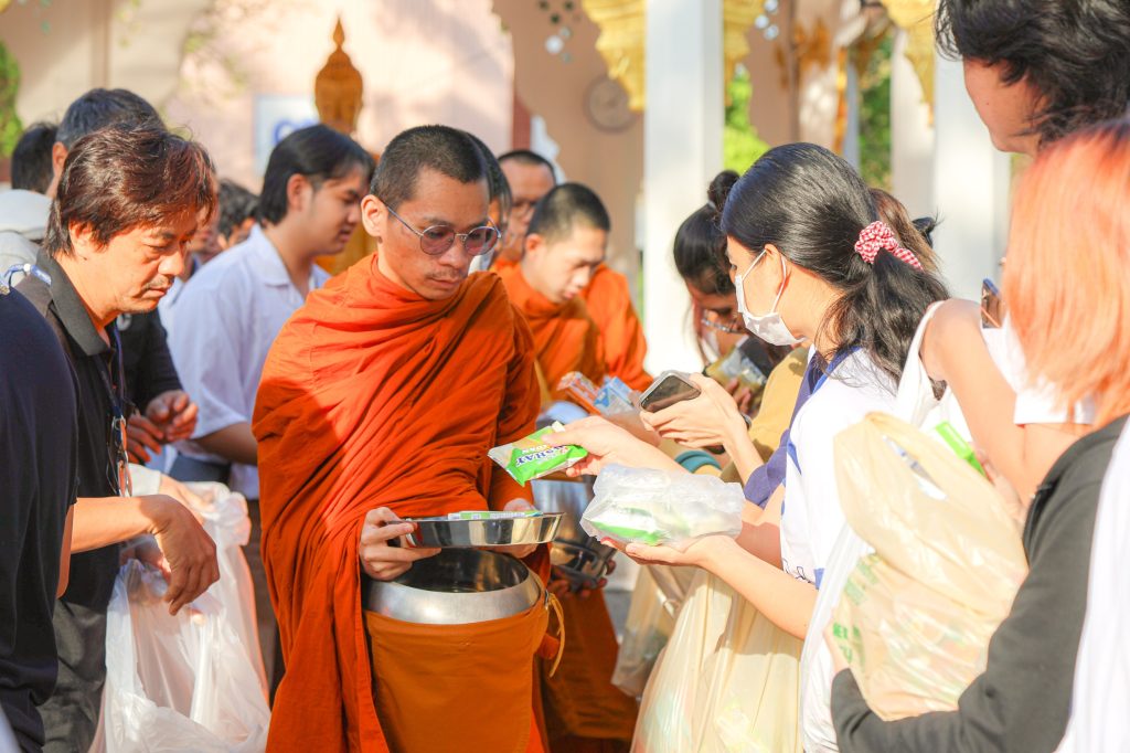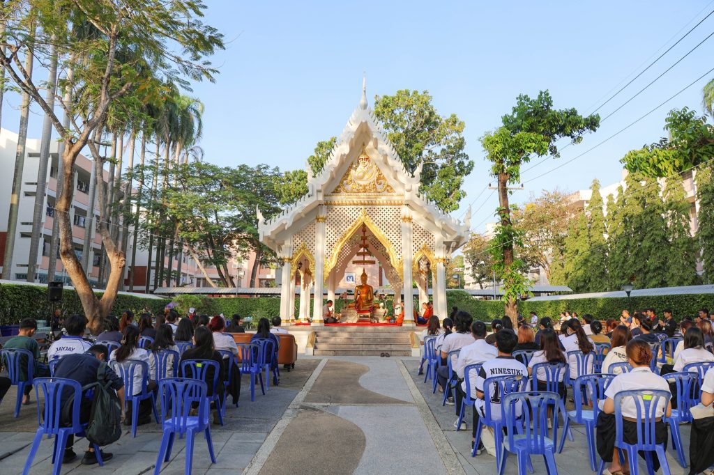 พระสงฆ์ได้ประกอบพิธีทางศาสนา โดยมีตัวแทนนักศึกษานำกล่าวถวายข้าวพระพุทธและถวายสังฆทาน พร้อมกันนี้บุคลากรกองกิจการนักศึกษา และผู้เข้าร่วมงานได้ร่วมกันใส่บาตรและถวายภัตตาหารเช้าแด่พระสงฆ์ ก่อนจะรับการสวดอนุโมทนา กรวดน้ำ และประพรมน้ำมนต์เพื่อความเป็นสิริมงคลและความเจริญก้าวหน้าแก่ทุกท่านตลอดไป