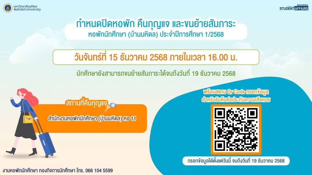 กำหนดการปิดหอพักนักศึกษา (บ้านมหิดล) ภาคต้น 2568