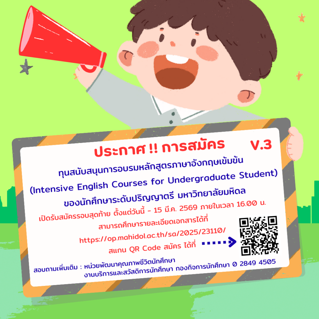 ทุนสนับสนุนการอบรมหลักสูตรภาษาอังกฤษเข้มข้น สำหรับนักศึกษาระดับปริญญาตรี มหาวิทยาลัยมหิดล