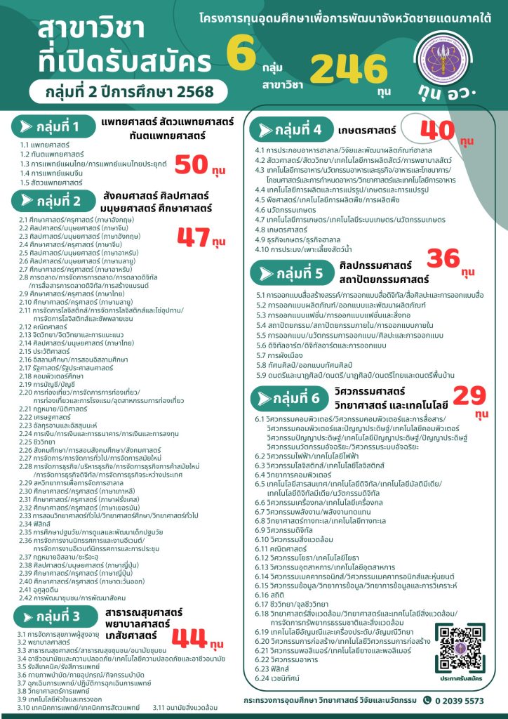 ประกาศรับสมัครผู้รับทุนการศึกษาโครงการทุนอุดมศึกษาเพื่อการพัฒนาจังหวัดชายแดนภาคใต้ ระยะที่ 4 ปีการศึกษา 2568 (กลุ่มที่ 2 สำหรับนักเรียนที่สามารถสอบเข้าศึกษาในสถาบันอุดมศึกษาได้)