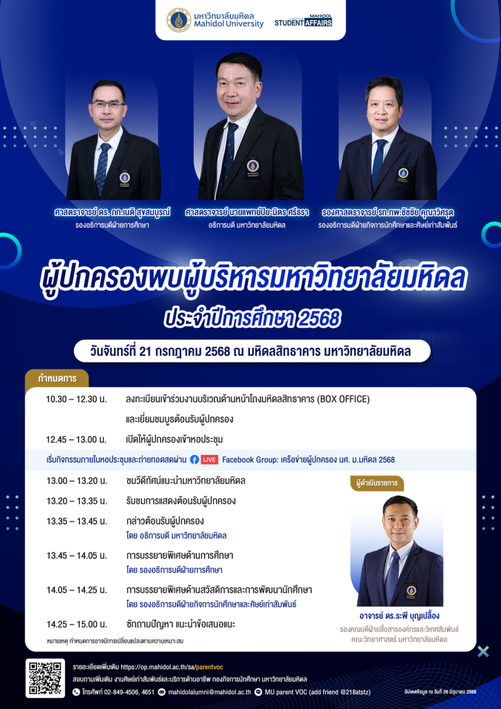 เป็นกิจกรรมสำหรับผู้ปกครองของนักศึกษาใหม่ ชั้นปีที่ 1 ประจำปีการศึกษา 2568 ซึ่งเป็นเวทีรับฟังเสียงของผู้ปกครองและเปิดให้ผู้ปกครองได้รับทราบถึงนโยบายของมหาวิทยาลัยด้านการศึกษา สวัสดิการและการพัฒนานักศึกษา รวมถึงได้เปิดโอกาสให้ผู้ปกครองได้มีส่วนร่วมเสนอข้อคิดเห็นในการพัฒนามหาวิทยาลัยในช่วงถาม-ตอบ รวมถึงการอำนวยความสะดวกให้แก่ผู้ปกครองในการติดตามข่าวสารจากมหาวิทยาลัยมหิดลผ่านช่องทางกลุ่ม Facebook: เครือข่ายผู้ปกครอง นศ. ม.มหิดล 2568 ทั้งนี้ท่านผู้ปกครองสามารถเข้าร่วมกลุ่มและกิจกรรมได้ตามความสมัครใจ